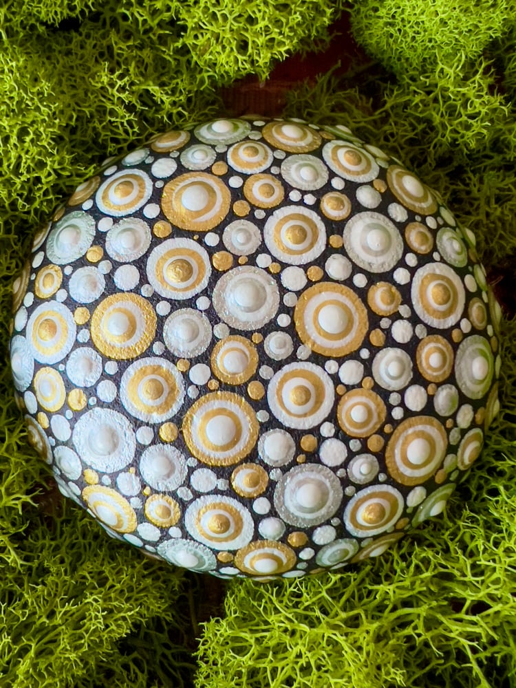 Oh gosh, the beauty and texture of this stone will take your breath away. It's a round stone just shy of 3" across. I've hand dotted it with multiple, multiple, multiple layers of gold, silver, and white to create the illusion of champagne bubbles so the texture is something else! Yummy!