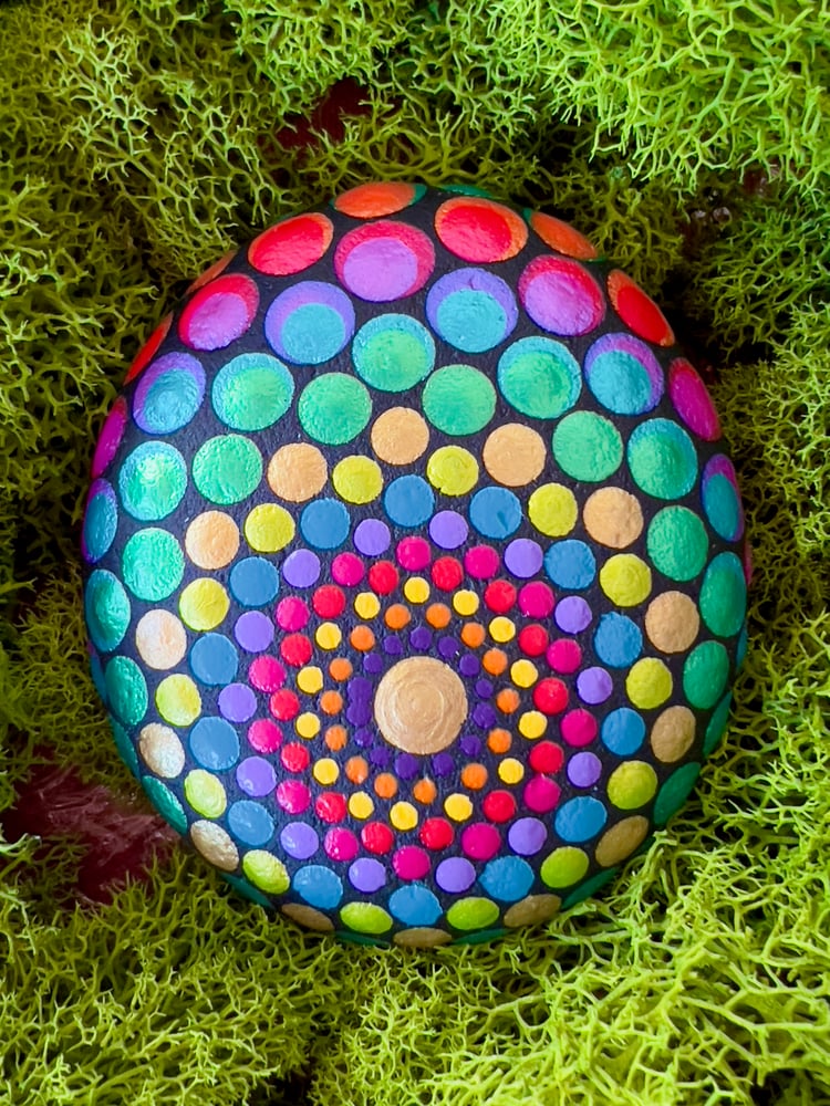 I've hand dotted this 2.5" oval stone with all the colors of an iridescent rainbow! I hand sourced this stone from the cold waters on the coast of Washington state.