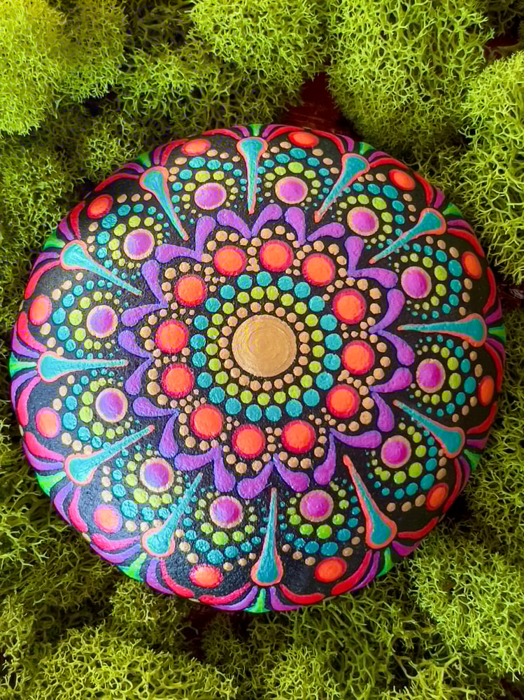 I've hand painted this chubby 4" stone in the bright iridescent colors of teal blue, orange, red, purple and shimmering greens. I love to combine the dots and swishes in this design. I hand sourced this stone from the cold waters on the coast of Washington state.