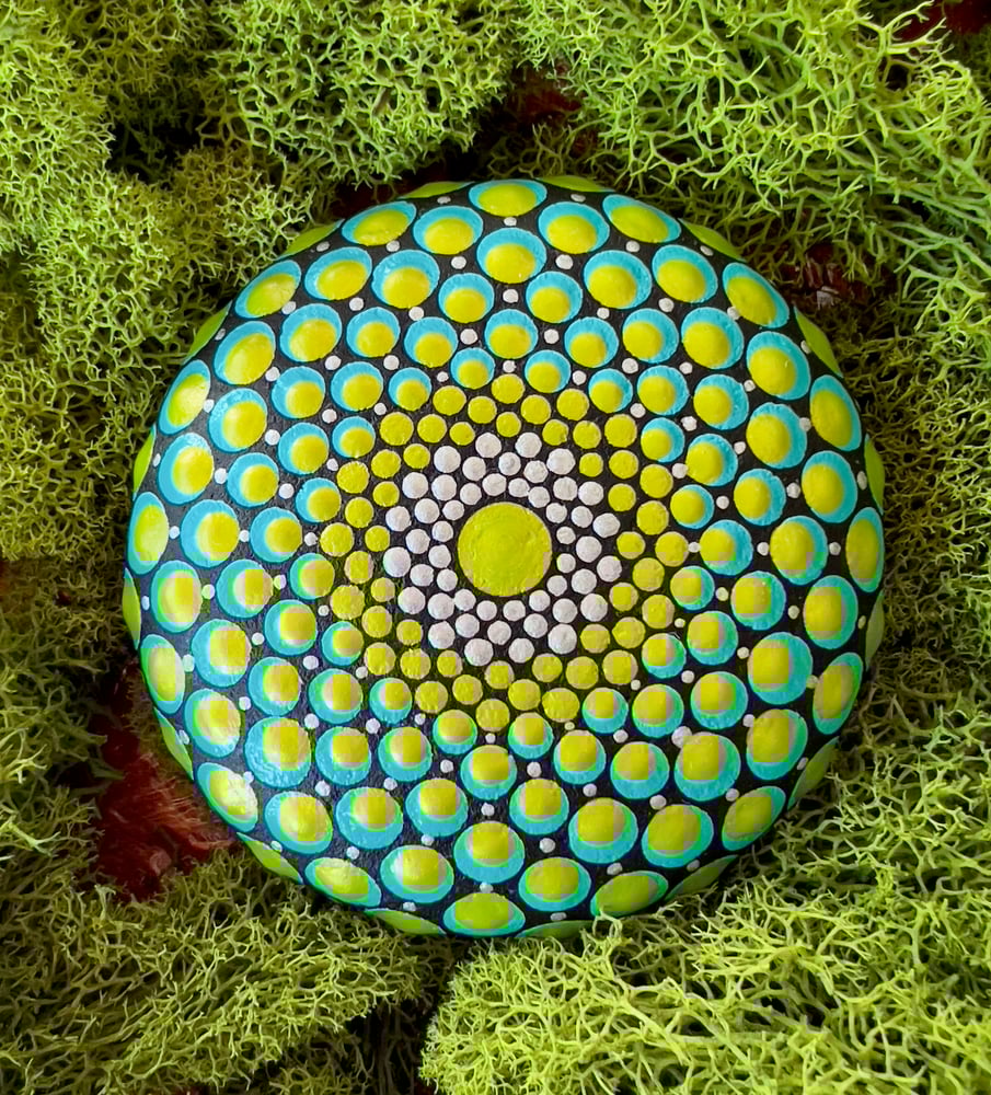 This stunning 3" stone shimmers with layers of teal blue, chartreuse green, and platinum silver acrylic paint. I love the star shape that emerged in the center of the mandala design as I was painting it. I hand sourced this stone from the cold waters off the coast of Washington state.